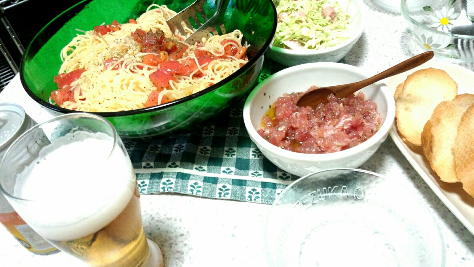 冷製パスタとバゲットにディップ